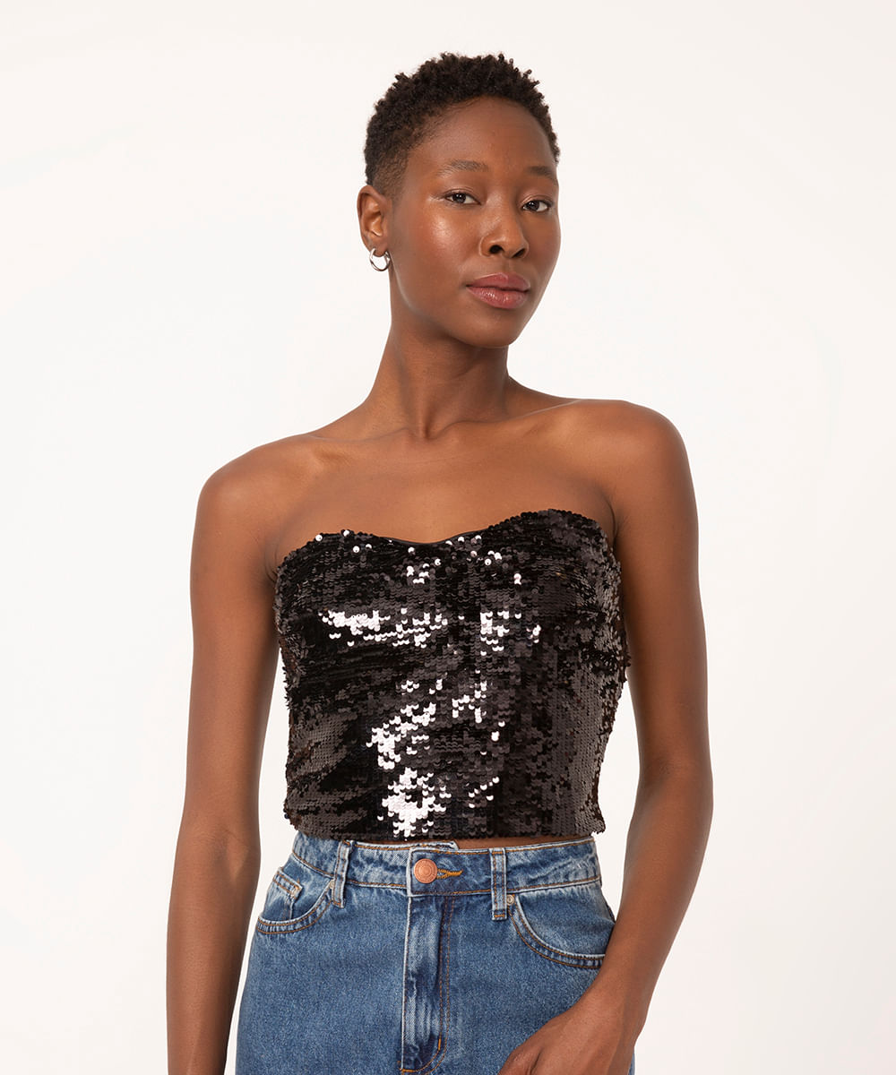 top corset cropped de paetê preto