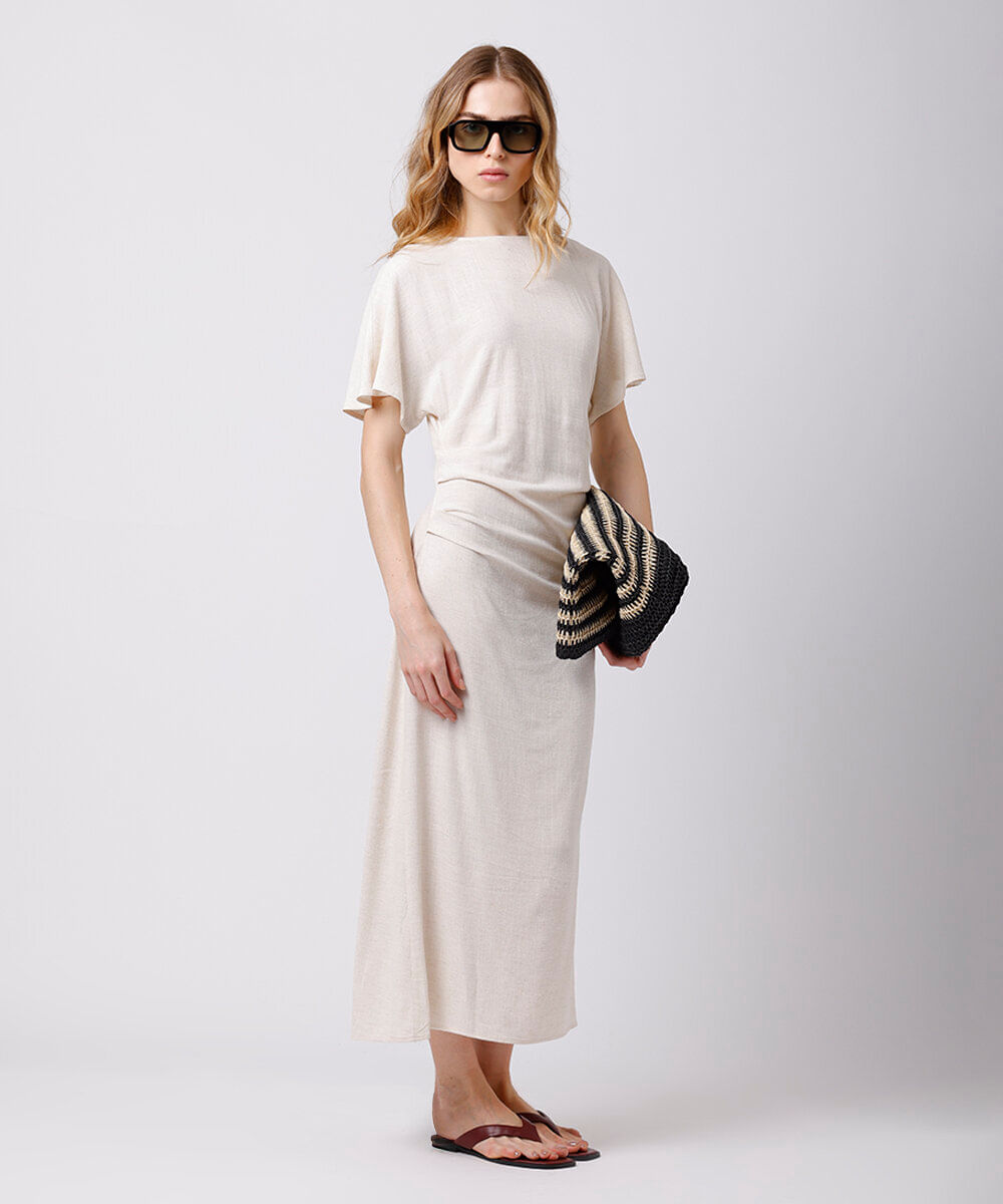vestido midi feminino com linho e pregas mindset bege
