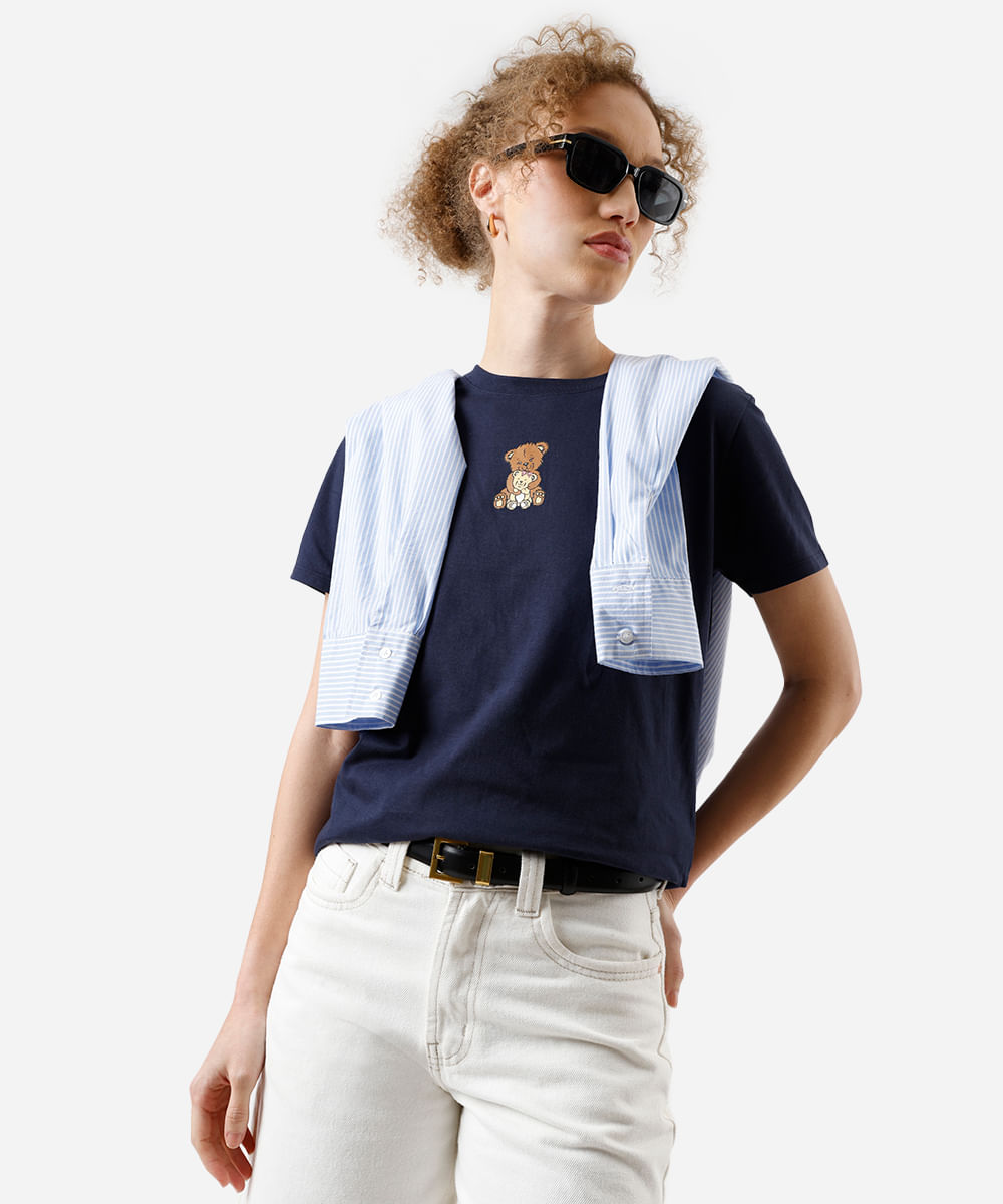 camiseta feminina de algodão ursinhos azul
