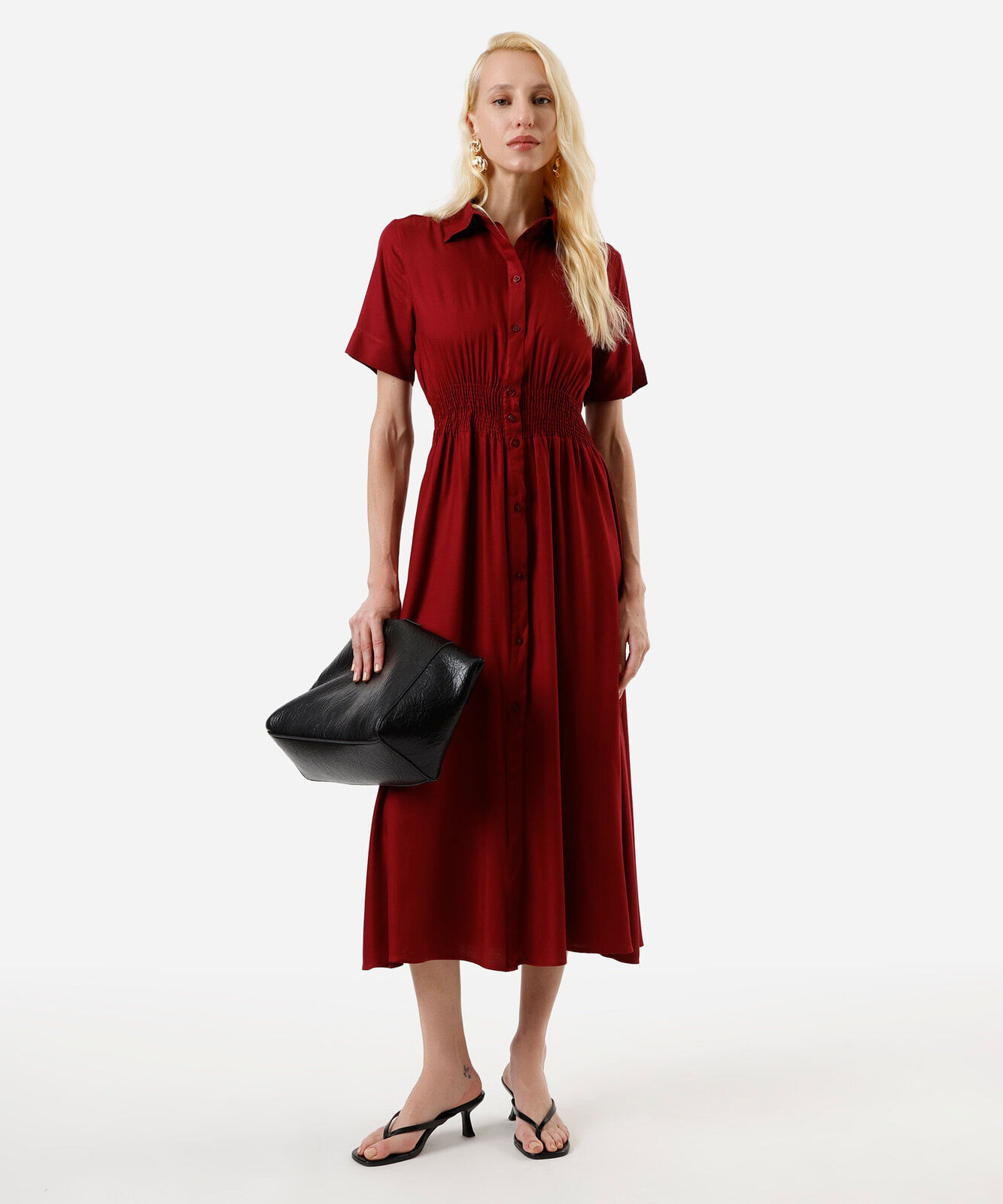 vestido midi chemise feminino de viscose manga curta vinho