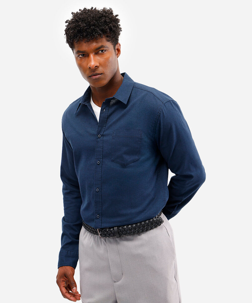 camisa comfort com linho manga longa azul marinho