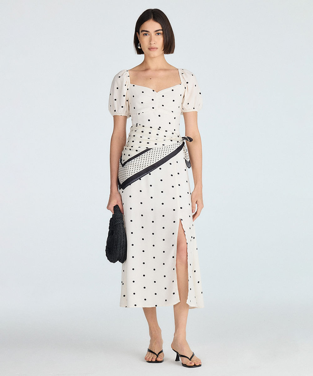 vestido longo feminino de viscose poá bege