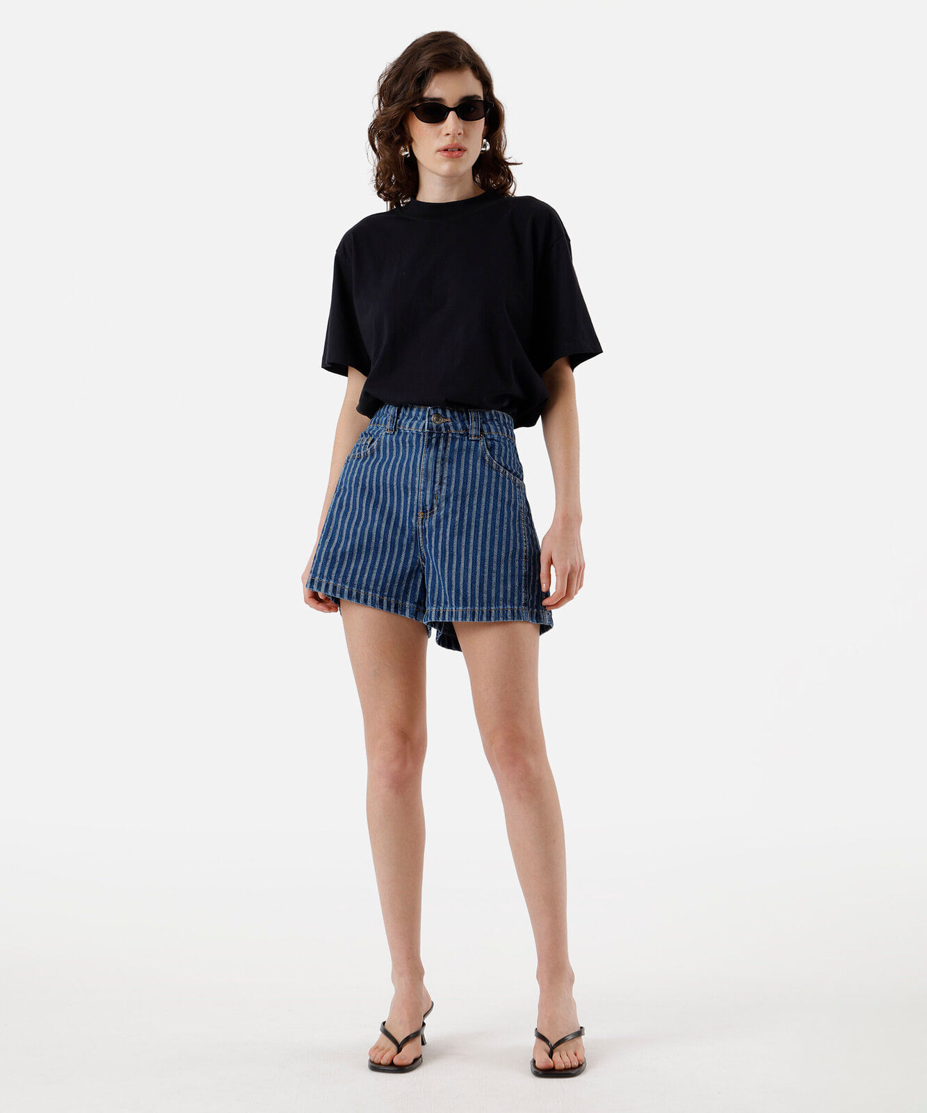 short feminino jeans cintura média listrado azul