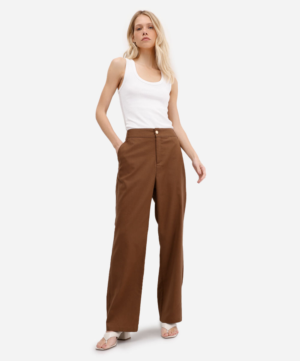 calça reta feminina com linho cintura alta marrom