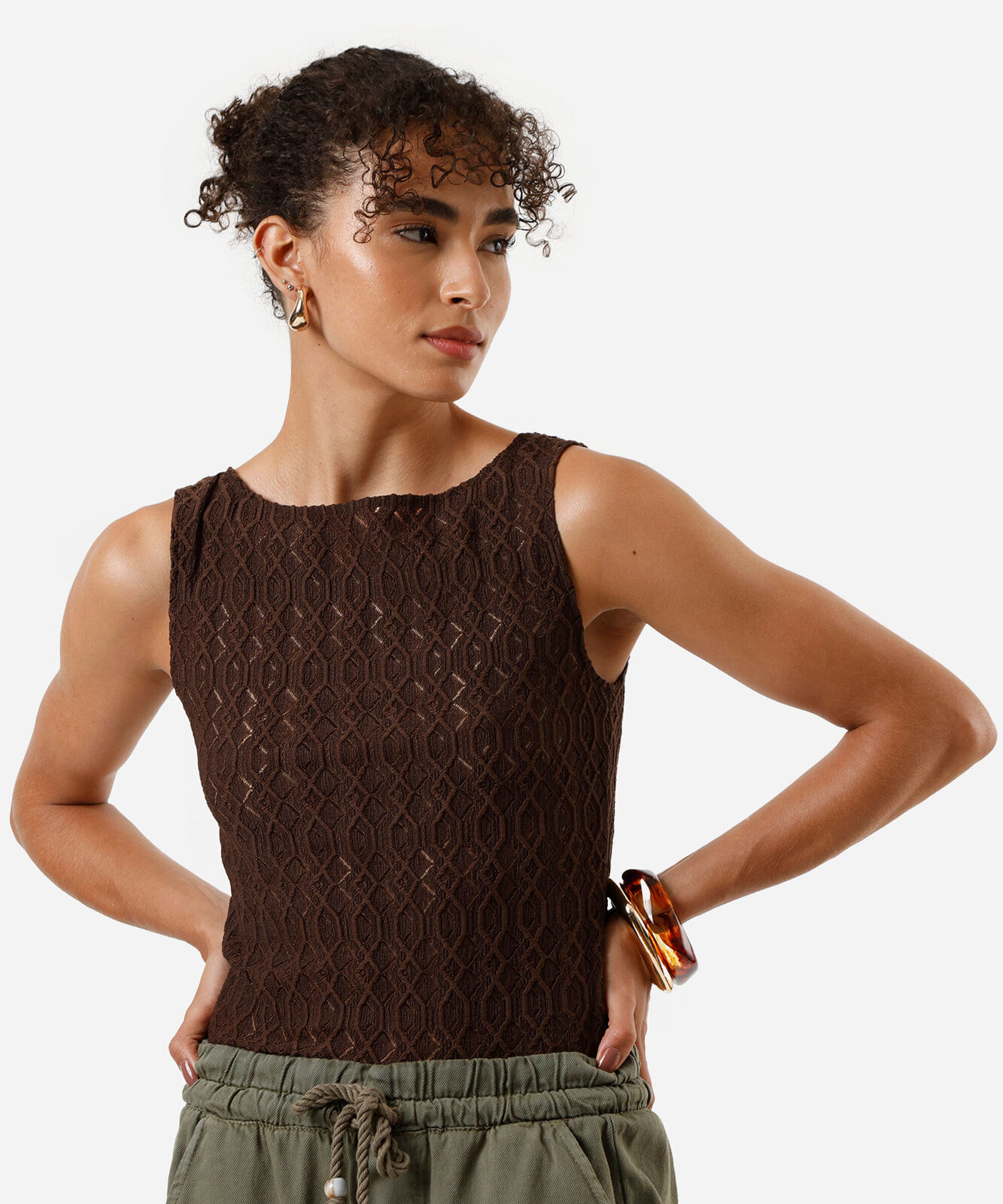 regata feminina decote canoa texturizada marrom
