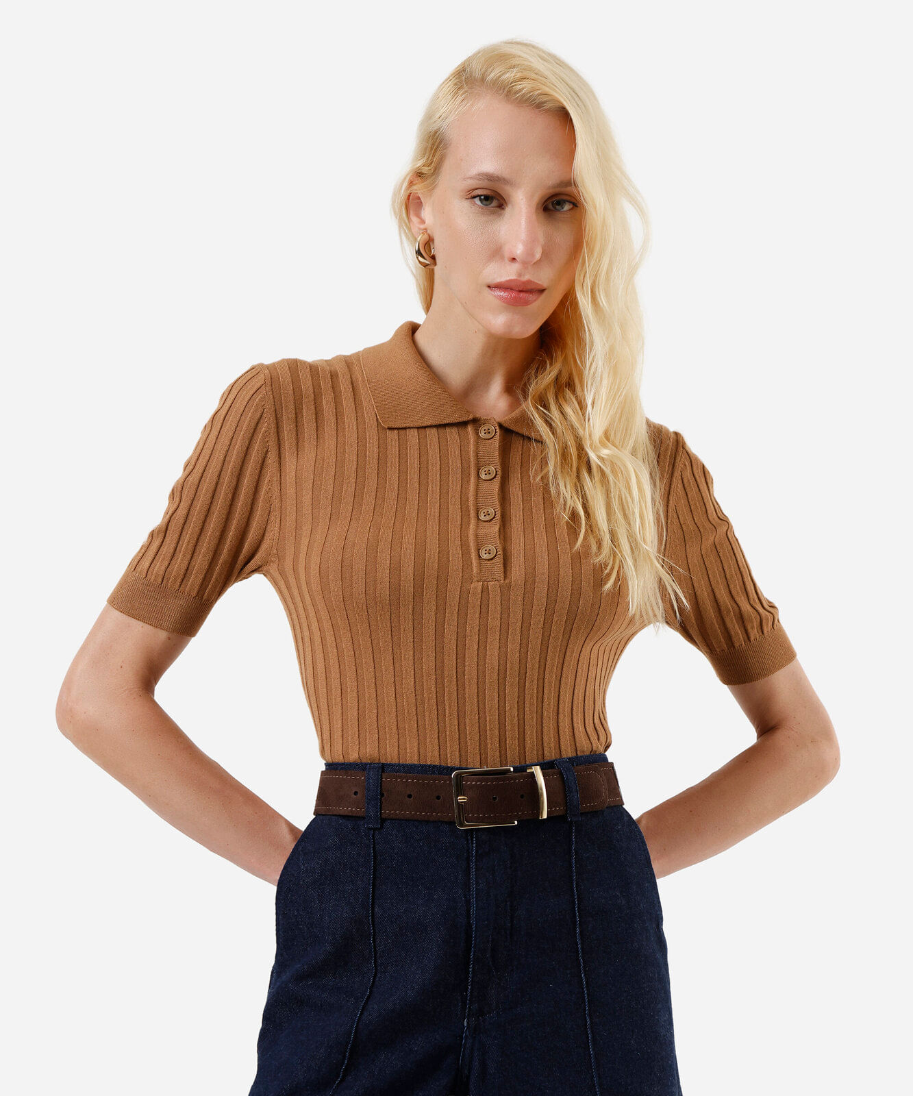 polo feminina de tricot canelada marrom