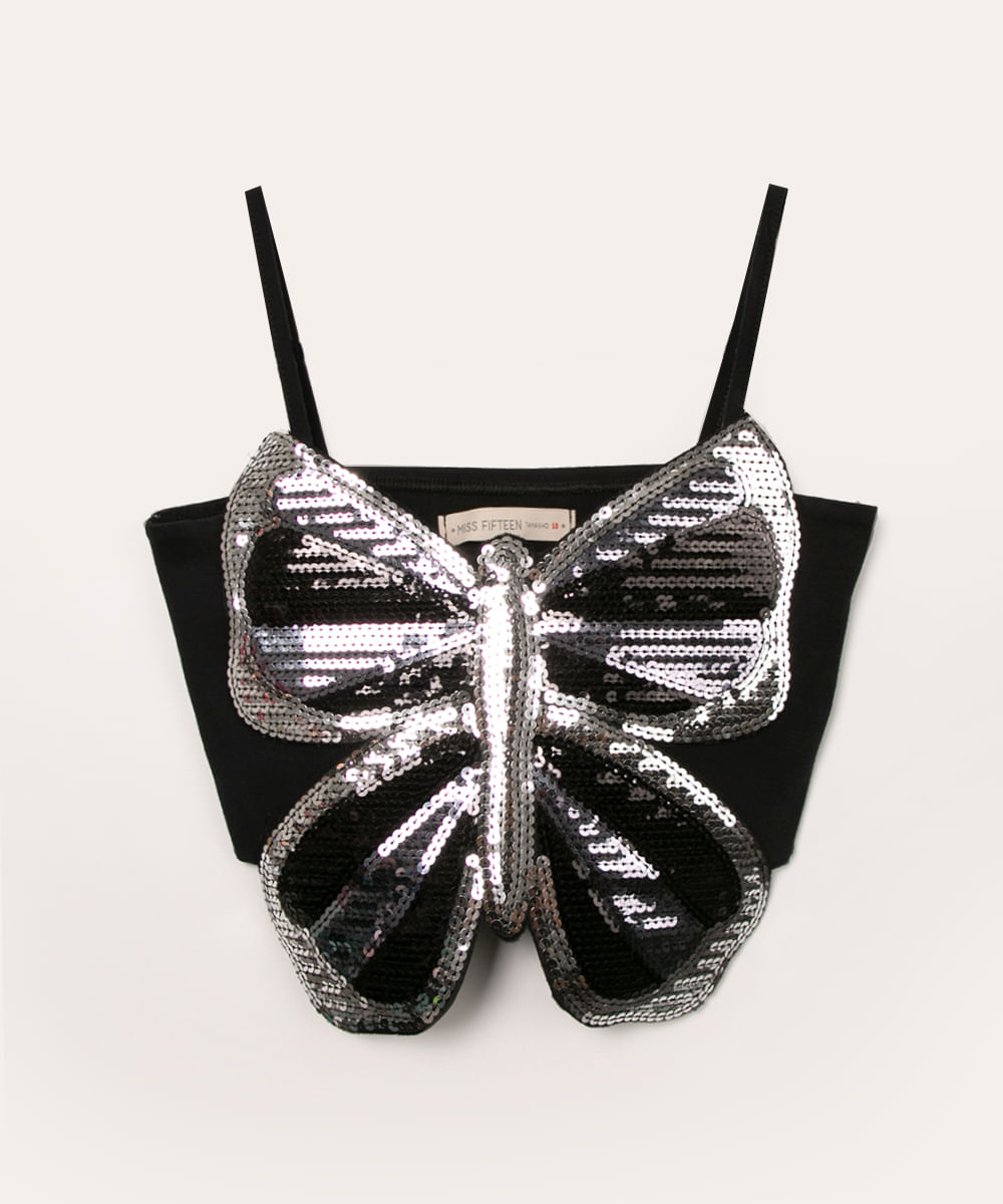 regata juvenil cropped borboleta com paetê preto
