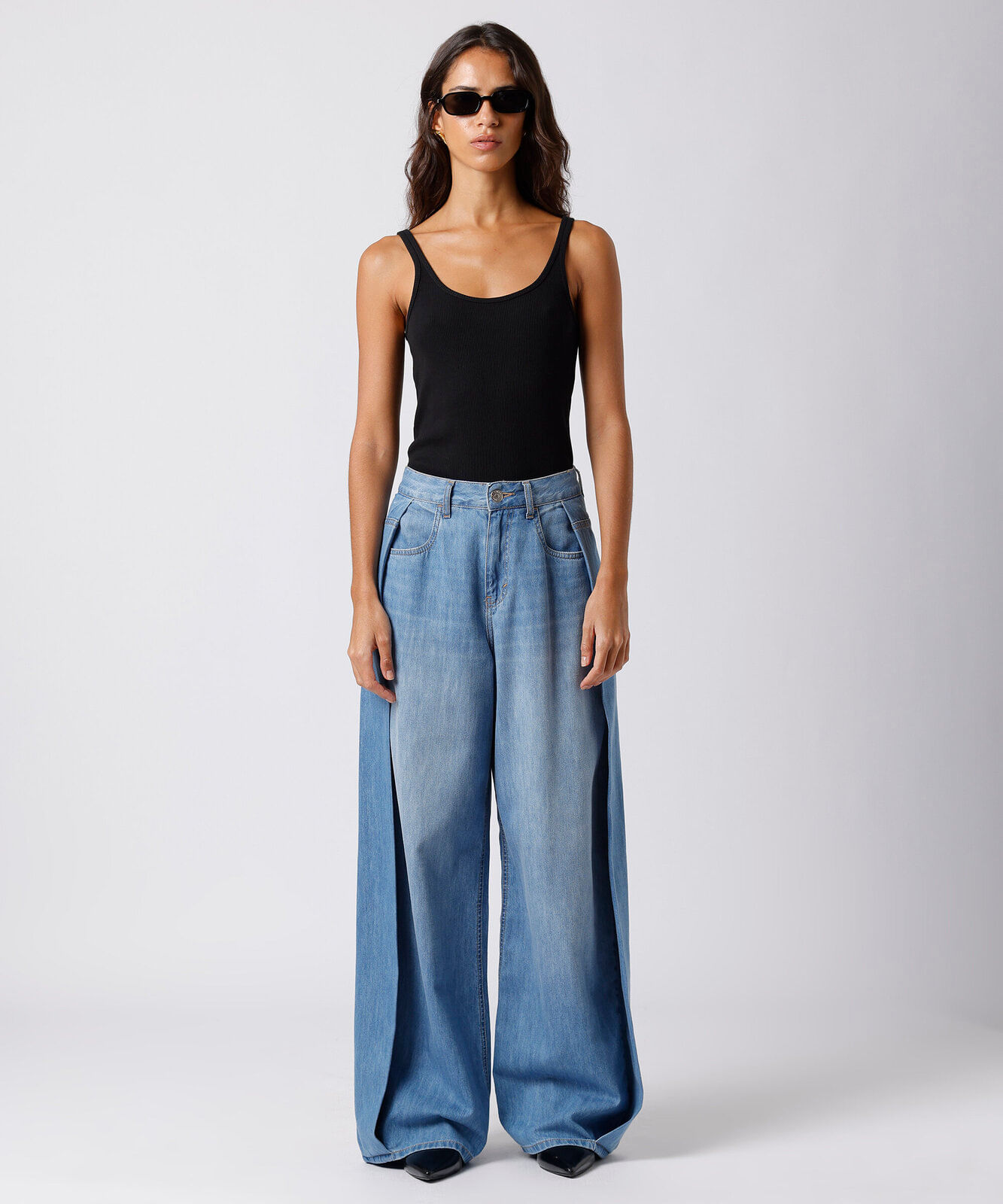 calça wide leg feminina jeans com pregas mindset azul