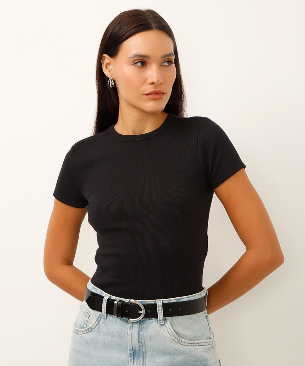 blusa baby look manga curta canelada preta