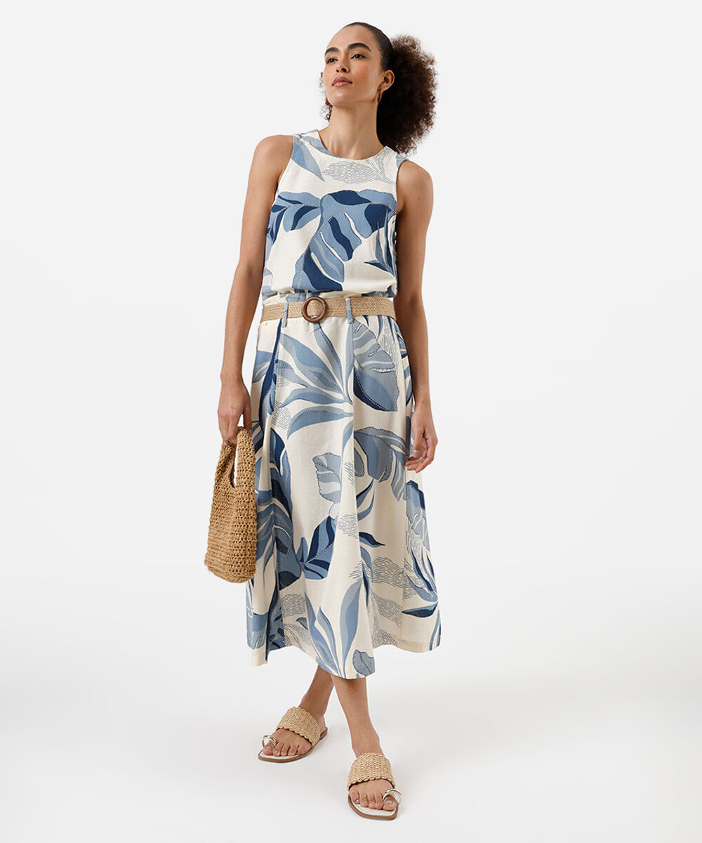 saia midi feminina com linho e cinto folhagens colorida
