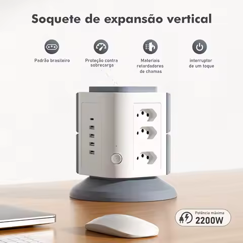Extensão Vertical com 9 Tomadas BR + 4 USB + Type-C - 2200W, Proteção Sobrecarga e Design Compacto para Casa/Escritório