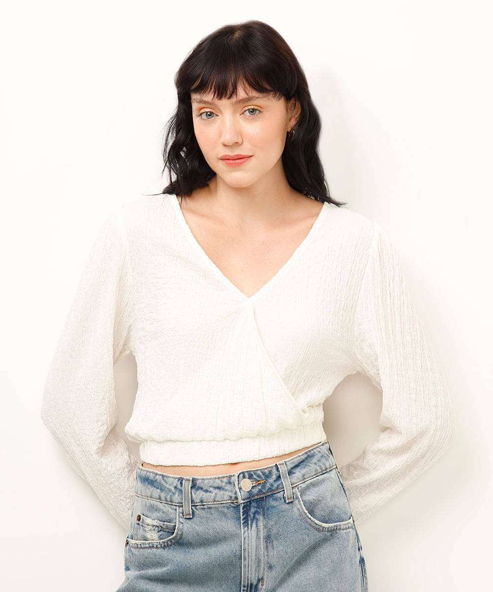 blusa com transpasse manga bufante texturizada off white