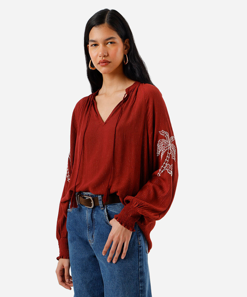 blusa feminina texturizada com amarração marrom