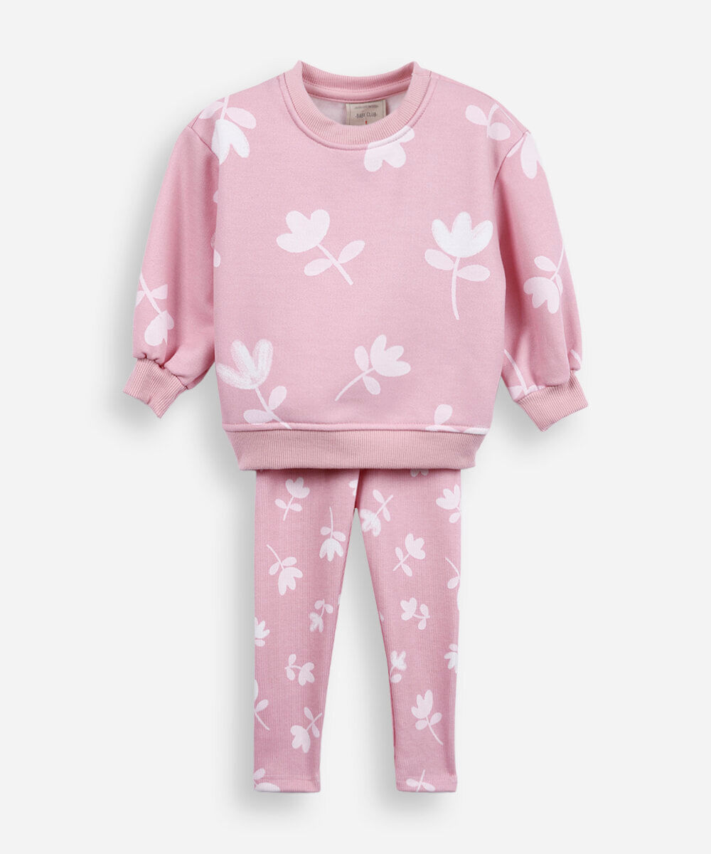conjunto longo infantil com algodão floral rosa