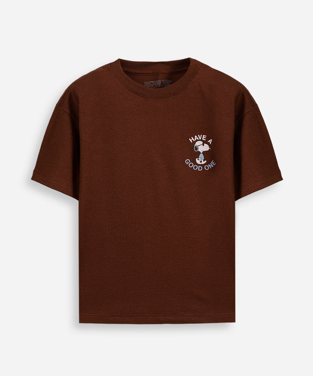 camiseta infantil com algodão texturizada snoopy marrom