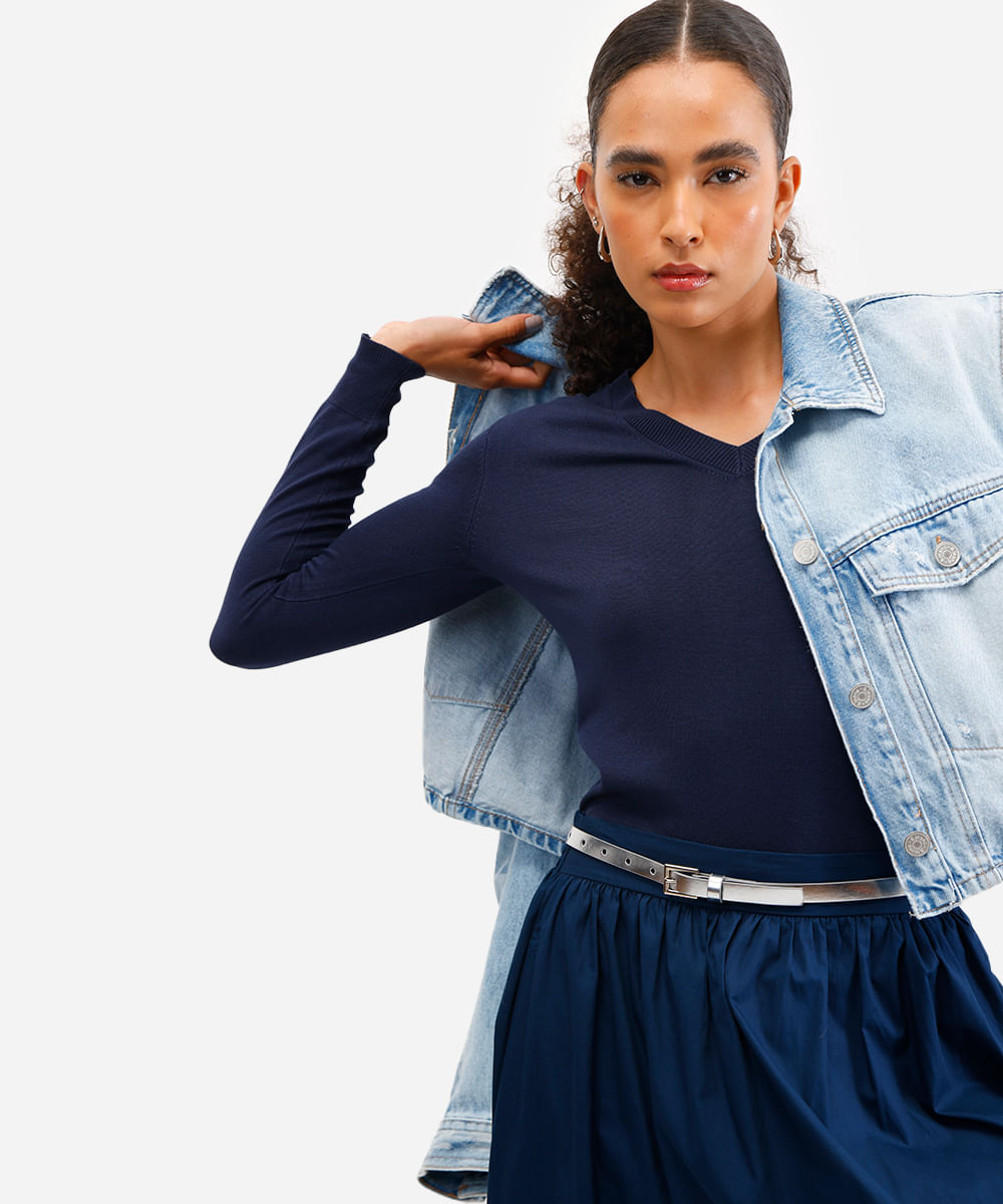 suéter básico feminino de tricot gola v azul