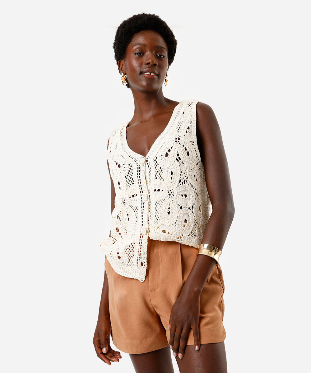 colete feminino de crochê floral bege