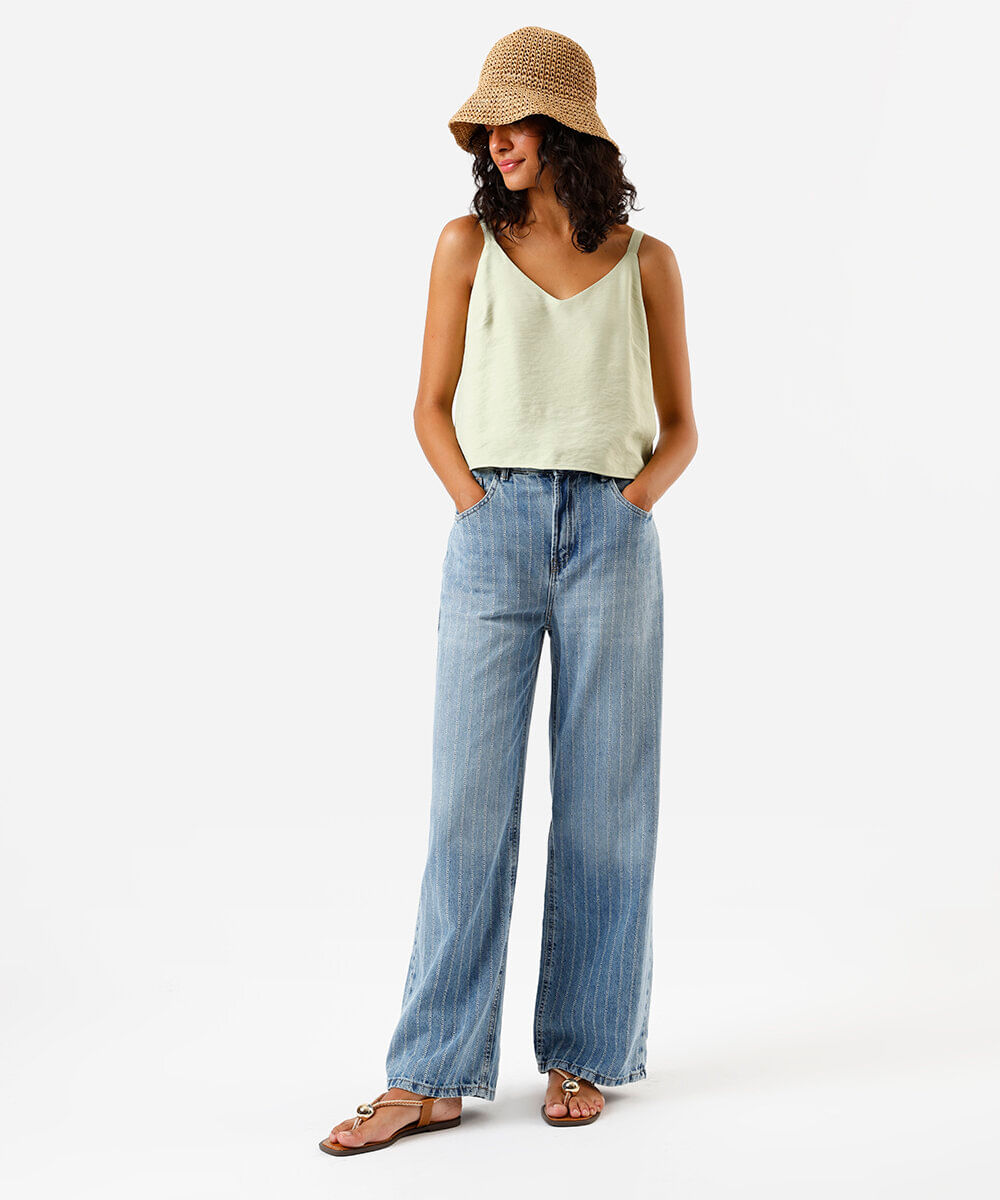 calça feminina oversized cintura média listrada azul