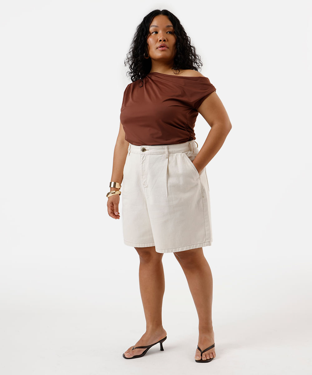 bermuda feminina de sarja com pregas plus size bege