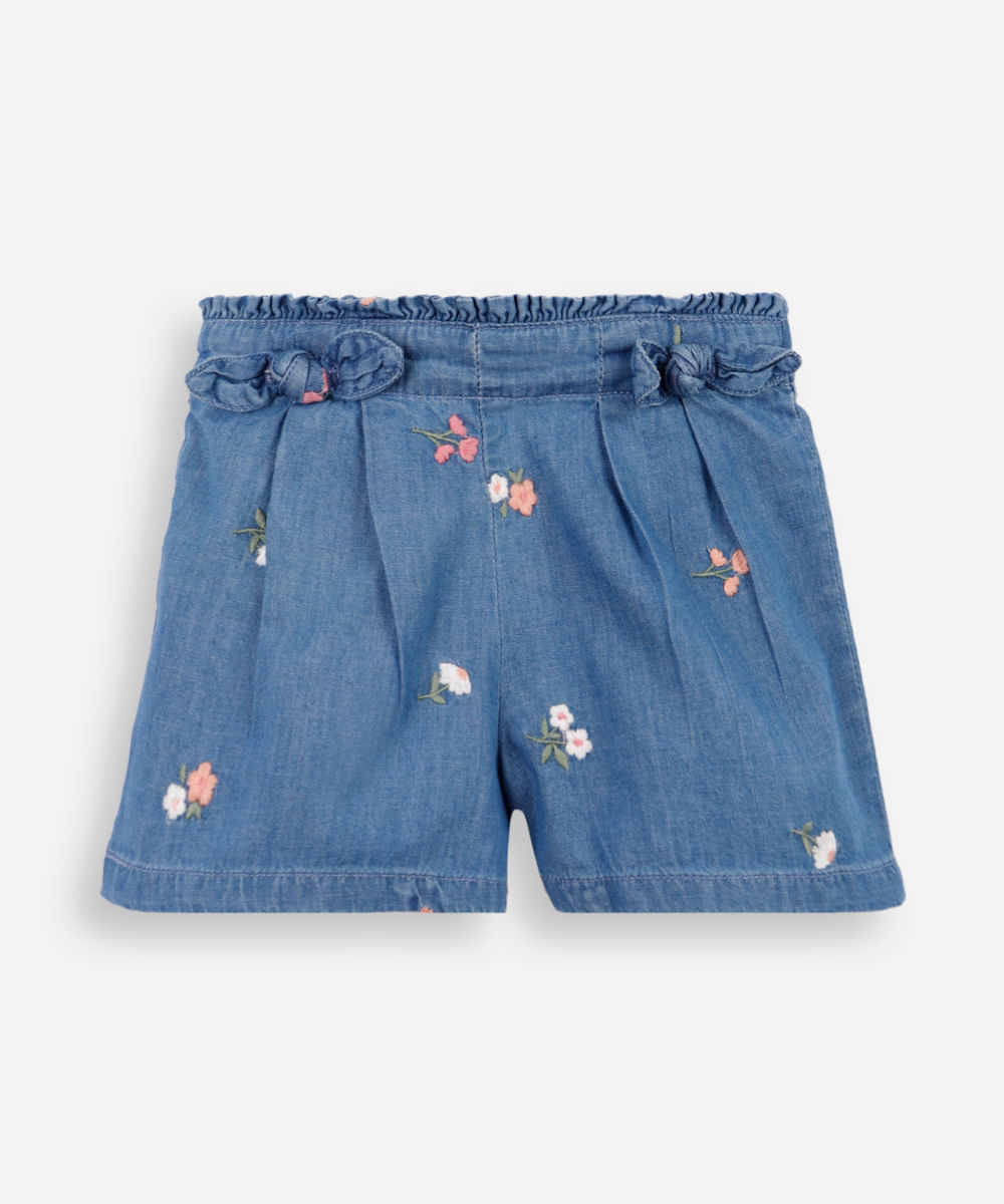 short clochard infantil jeans com bordados floral azul