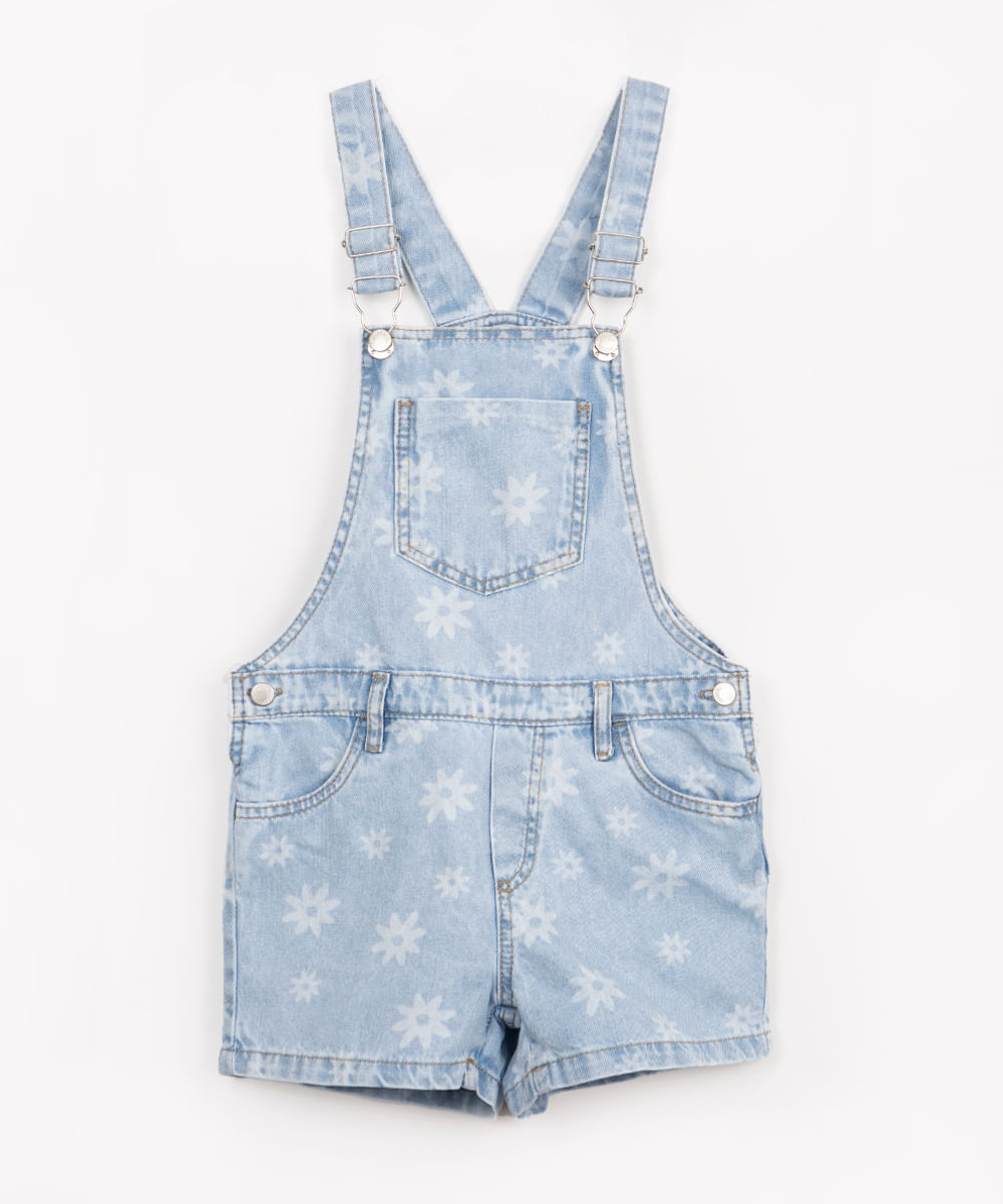 jardineira jeans infantil floral com bolsos azul claro