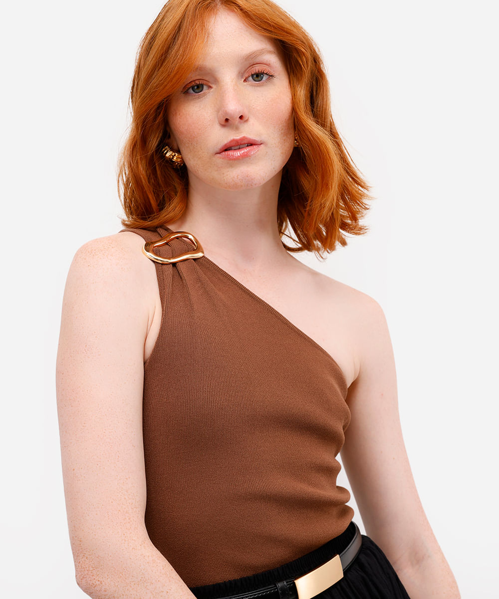 blusa ombro único feminina de tricot com fivela marrom