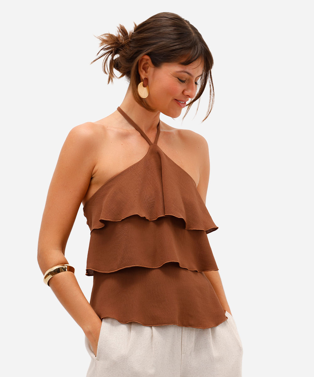 blusa frente única feminina com babados marrom