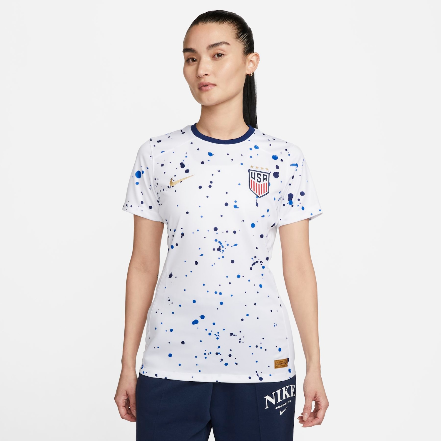 Como uma obra de arte abstrata, a camisa U.S. 2023... Mais Home é a ordem em meio ao caos. Um design com respingos de tinta garante que não haja 2 padrões de camisa iguais - uma referência aos indivíduos únicos que, juntos, criam uma equipe que ultrapassa sem medo os limites de seu esporte. Detalhes dourados em toda a peça combinam com um orgulho interno para comemorar os 4 campeonatos mundiais incomparáveis da equipe. Como outras camisas da nossa coleção Stadium, ela combina detalhes da réplica com tecnologia que absorve o suor para oferecer um visual pronto para o jogo inspirado nos Stars and Stripes.BenefíciosTecnologia Nike Dri-FIT absorve o suor da sua pele para evaporação mais rápida, ajudando a manter você seco e confortável.O design de réplica é baseado naquele que os profissionais usam em campo.Detalhes do Produto100% poliésterLavável à máquinaImportado Menos