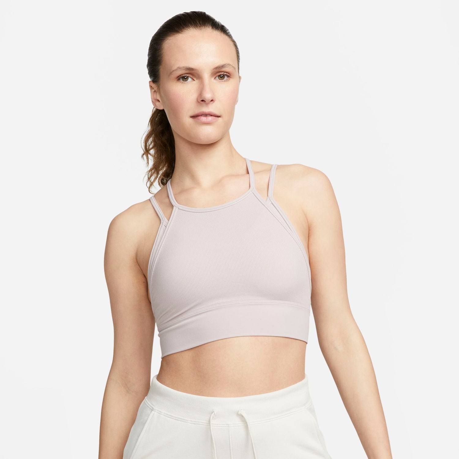 Vista este top esportivo de suporte suave, feito c... Maisom tecido irresistivelmente macio. Ele apresenta um decote alto para manter a sua confiança em movimentos rápidos e alças finas que mantêm o fluxo de ar quando o treino esquenta.Sensação de luxoO tecido é um material infinitamente confortável e incrivelmente elástico que proporciona uma sensação tão agradável que você vai querer usá-lo em qualquer lugar. Mais fino, leve e ainda mais resistente do que nossos fios tradicionais, ele tem um toque irresistivelmente macio e suave, enquanto promove uma sensação de compressão suave que envolve seu corpo, para que você possa se alongar e se mover sem limitações.Conforto antissuorTecnologia Nike Dri-FIT absorve o suor da sua pele para evaporação mais rápida, ajudando a manter você seca e confortável.Cobertura ajustávelOs bojos removíveis permitem que você mude o seu look e a sensação para se adaptar ao seu treino.Detalhes do ProdutoPainel frontal com nervurasBojos removíveisCorpo: 63% nylon/37% spandex. Reforço/forro: 88% nylon / 12% spandex. Tecido da parte superior do bojo/tecido da parte traseira do bojo: 100% poliéster. Bojo: 100% poliuretano.Lavável à máquinaImportado Menos