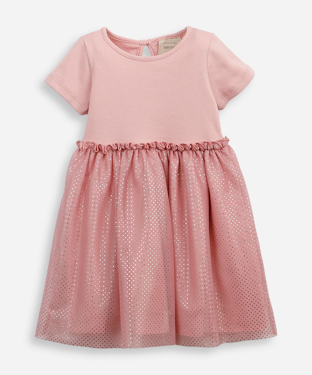 vestido infantil com tule floral metalizado rosa