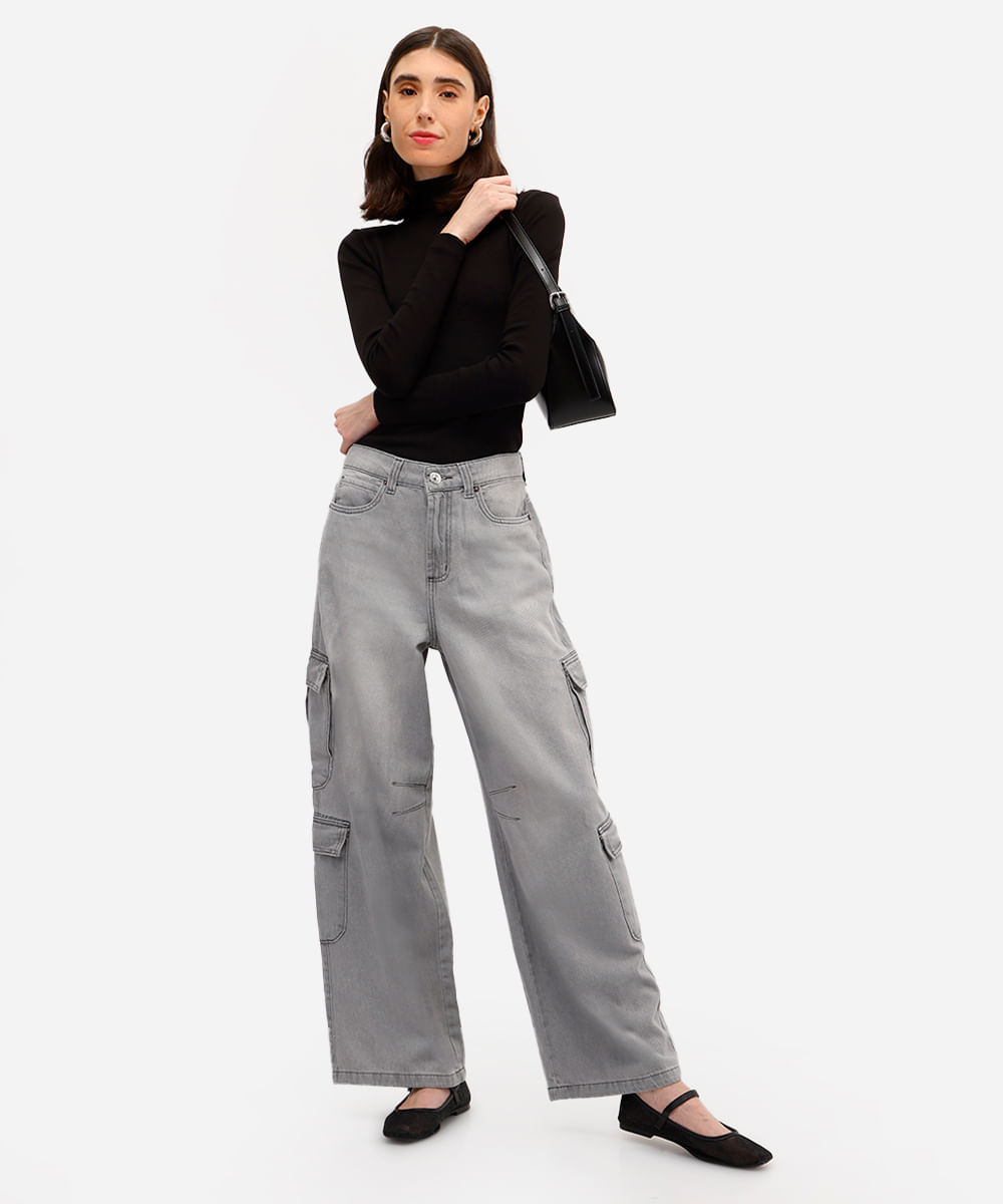 calça skater feminina jeans com bolsos cargo cinza